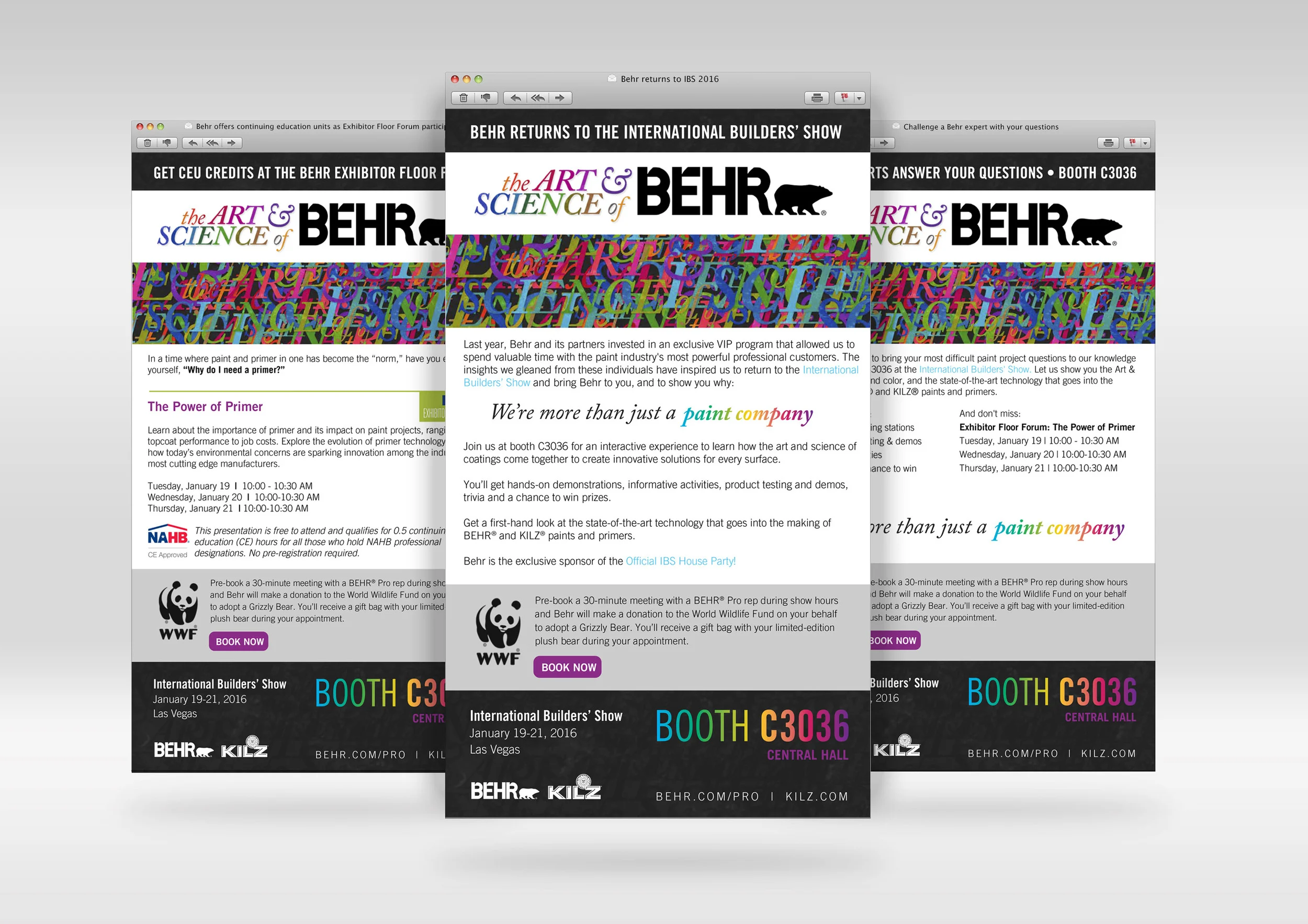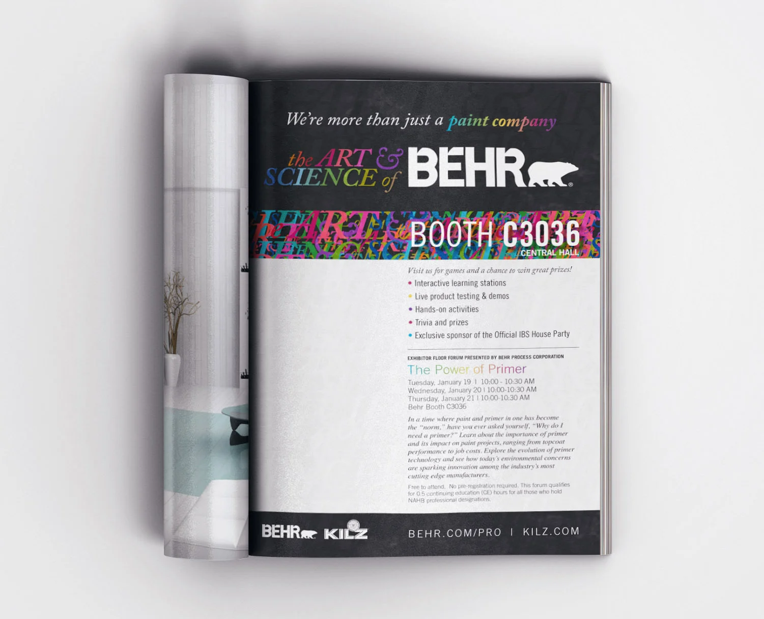 The Custom Exhibit team began working on the booth design, and I worked with Behr to implement a marketing campaign around The Art & Science of Behr. Pre-show emails, print ads, a booth punch card, on-site banners and signage tied the entire campaign together and drew attention to Behr as a key exhibitor at IBS.